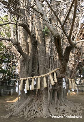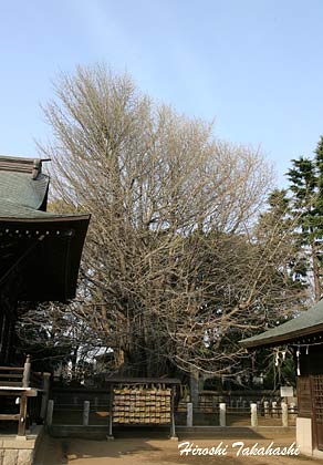 JR本八幡駅から数分の所、あたりの喧噪から隔離されたように葛飾八幡の社叢が生い茂る。本殿の東隣に、でんと根を下ろす姿は重量感にあふれる。